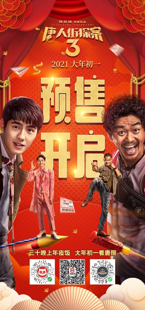 Trong số đó, “Thám tử phố Tàu 3” với tư cách là đại diện tiêu biểu của dòng phim thương mại chính thống trong nước về mặt loại hình hóa, công nghiệp hóa, hệ liệt hóa (T/N: hệ liệt là loạt phim/truyện… nhiều tập), đã cho thấy khả năng hút tiền siêu khủng ngay khi vừa ra mắt, đã đạt doanh thu phòng vé vượt mốc 1 tỷ NDT chỉ trong một ngày. Tính đến ngày 17 tháng 2, sau kỳ nghỉ lễ bảy ngày phim đã thu về 3.562 tỷ NDT và dẫn đầu thành công các phim trình chiếu dịp Tết Âm lịch.