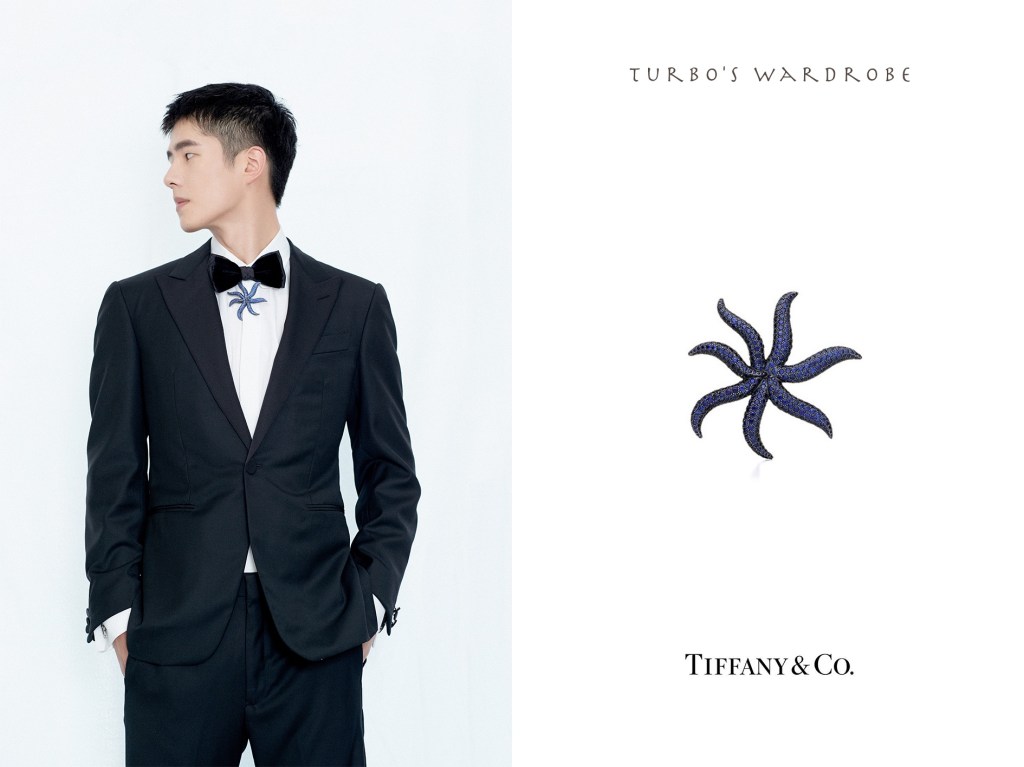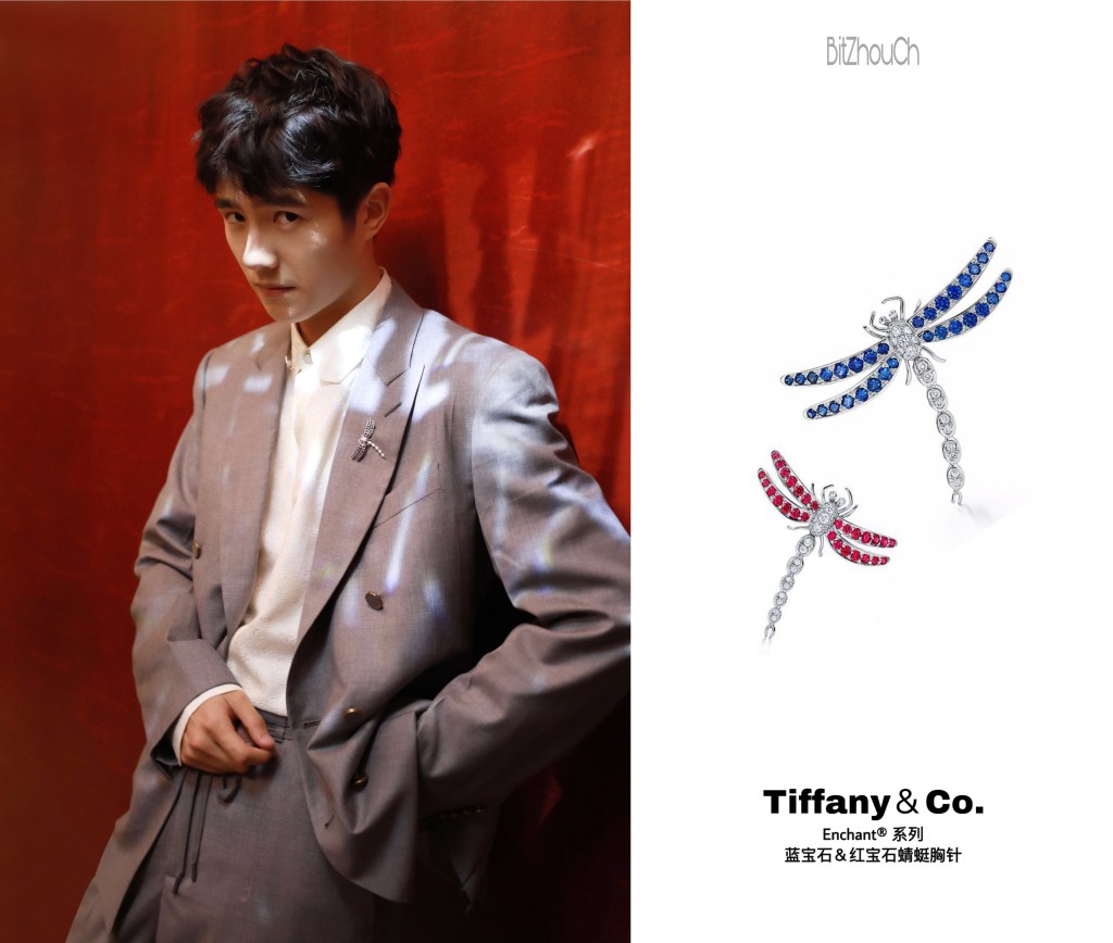 20181209 Lưu Hạo Nhiên tham dự sự kiện của Tiffany & Co. ở Tây An, đeo trang sức của Tiffany & Co. bao gồm: hoa tai thuộc dòng sản phẩm Tiffany Paper Flowers dùng làm cài áo, cài áo hình chuồn chuồn bằng bạch kim gắn kim cương, nhẫn và vòng tay thuộc dòng sản phẩm Tiffany T.