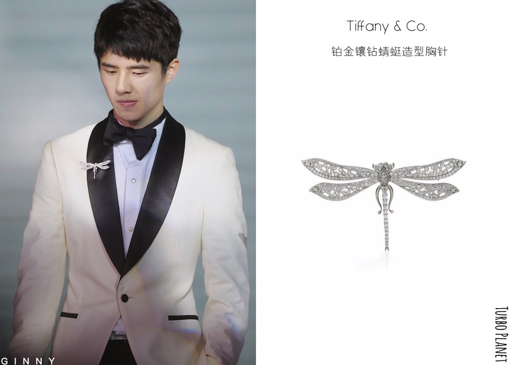 20191119 Lưu Hạo Nhiên tham dự Lễ khai mạc Liên hoan phim Kim Kê Bách Hoa 2019, đeo 2 cài áo hình chuồn chuồn (vàng hồng 18K gắn kim cương và bạch kim gắn sapphire) thuộc dòng sản phẩm Tiffany Enchant của Tiffany & Co.