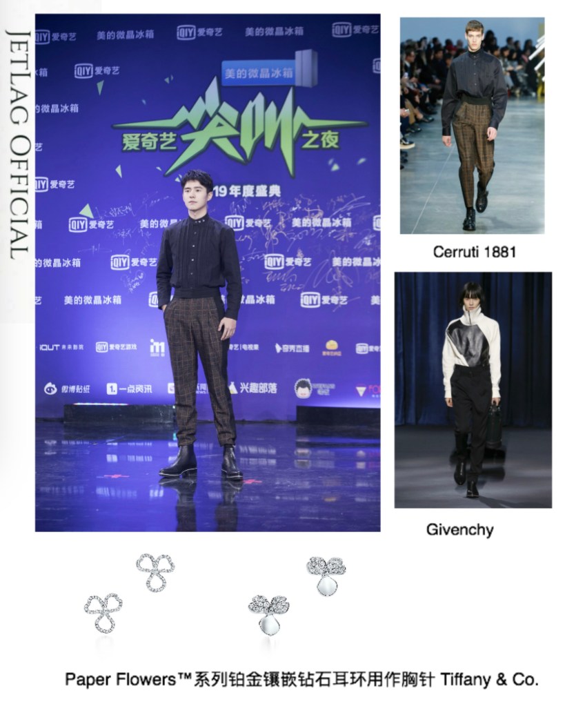 20181201 Lưu Hạo Nhiên tham dự sư kiện iQiyi Scream Night, đeo hoa tai bạch kim gắn kim cương thuộc dòng sản phẩm Paper Flowers của Tiffany & Co. dùng làm cài áo.