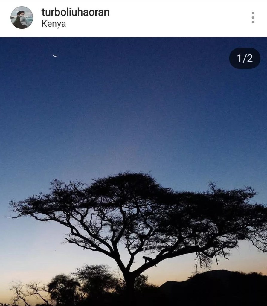 Khi chúng tôi quay trở lại khu lều trại vào ban đêm, chúng tôi đột nhiên nhìn thấy một con báo bước đi trên cây ở phía xa xa. Con báo rất đẹp và uyển chuyển. Hạo Nhiên đệ đệ đã nhanh chóng rút điện thoại ra để tác nghiệp, và đây là bức ảnh.
