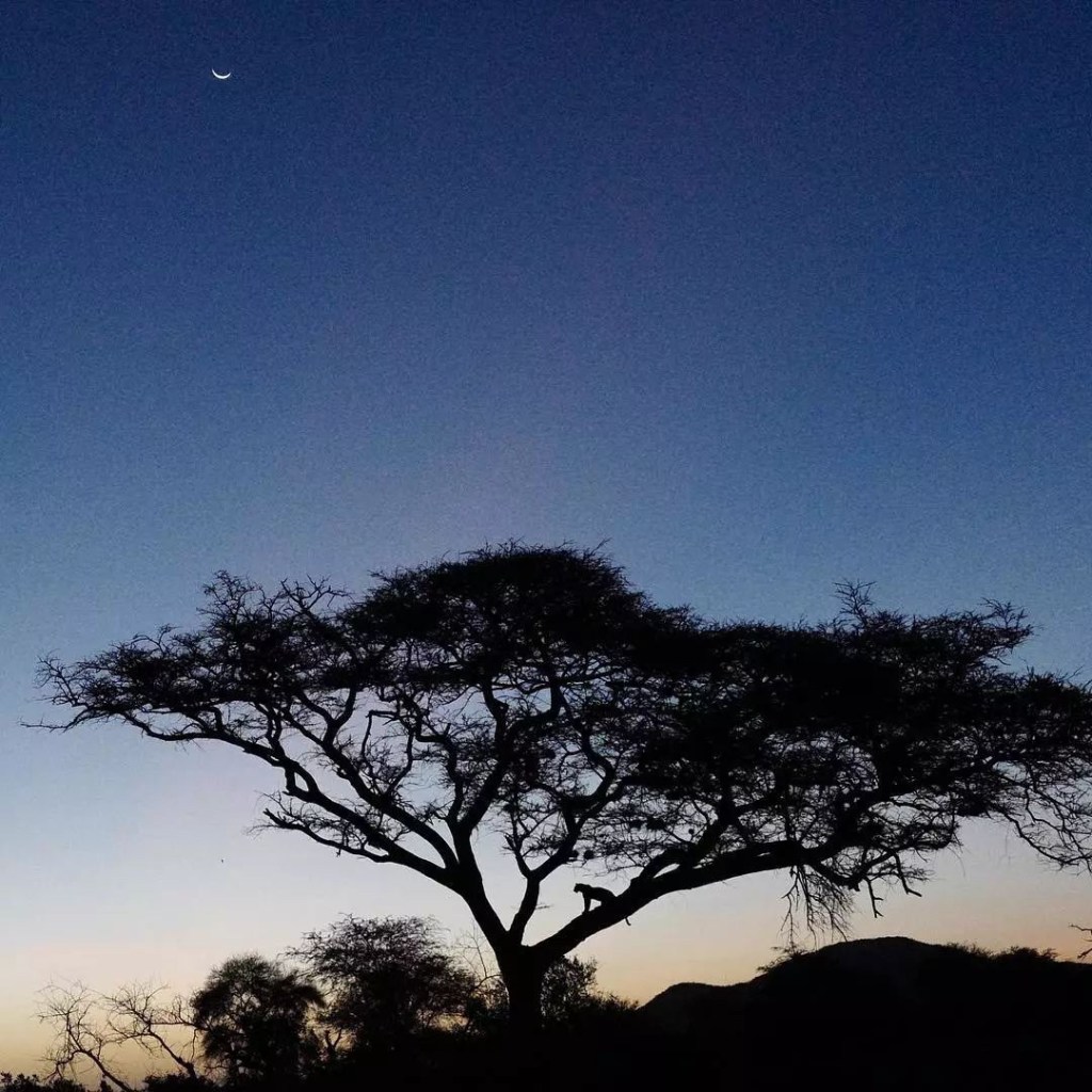 Bầu trời đêm ở châu Phi rất đẹp. Từ xa có thể thấy mặt trăng treo trên bầu trời xanh trong. Cảnh đẹp như tranh vẽ vậy.