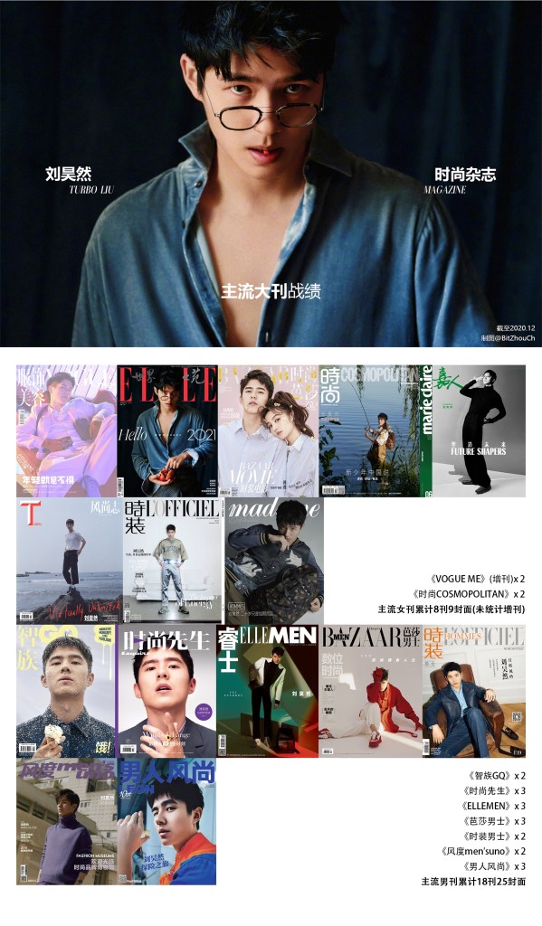 Lưu Hạo Nhiên đã xuất hiện trên 9/10 Thập đại tạp chí (bao gồm 5 tạp chí Ngũ đại nữ và 5 tạp chí Ngũ đại nam), và đã 2 lần hoàn tất Ngũ đại nam.