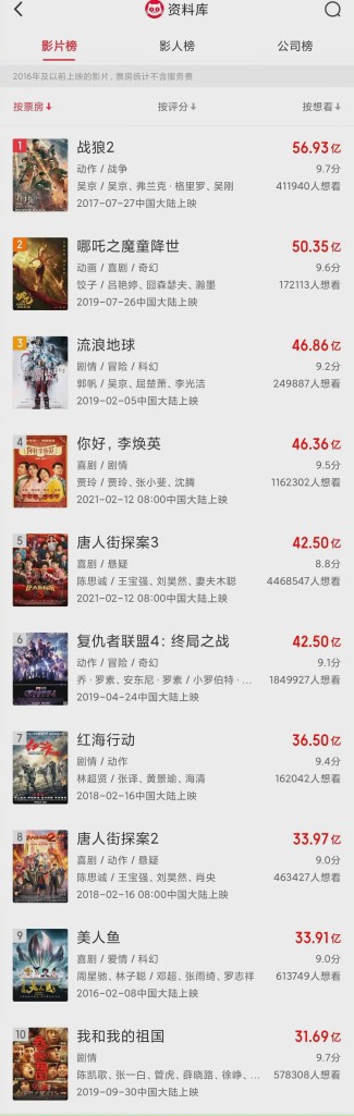 Ghi chú về phim: Dự kiến chiếu chính thức vào dịp Tết Âm lịch 2020 (25/1/2020), bị hoãn chiếu do dịch bệnh Covid-19, nên dời ngày chiếu sang Tết Âm lịch 2021 (12/2/2021). Tính đến tháng 5/2021, phim có doanh thu 4.523 tỷ NDT, đứng thứ 5 trong TOP các phim điện ảnh có doanh thu cao nhất trong lịch sử điện ảnh Trung Quốc.