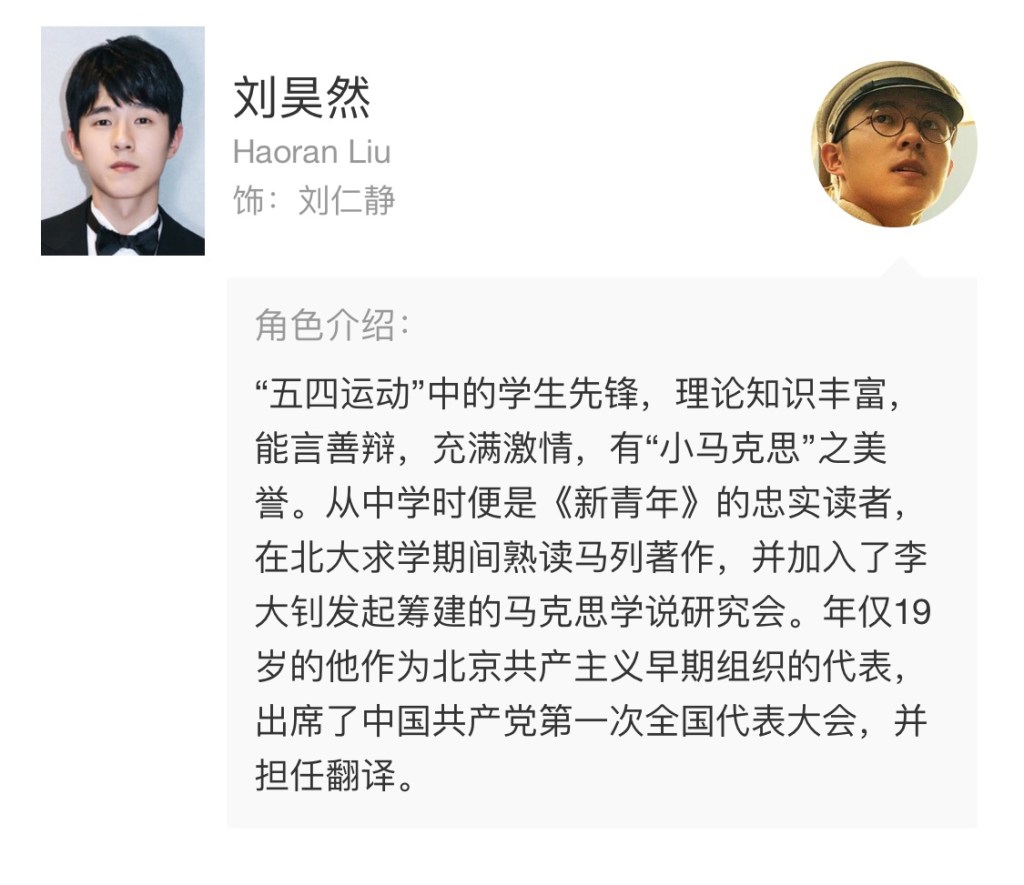 Nam diễn viên trẻ Lưu Hạo Nhiên đã xuất hiện trong các bộ phim chủ lưu như “Kiến quân đại nghiệp” và “Tôi và Tổ quốc tôi.” Trong cuộc phỏng vấn với phóng viên của “Thời báo Hoàn Cầu,” anh nói, “sự khác biệt lớn nhất trong việc tham gia phim đề tài chủ lưu là bạn không hoàn toàn tạo ra một nhân vật mới tinh. Bởi vì có hình ảnh của một người sẵn sàng hi sinh vì đại cục, điều đầu tiên là cần hiểu vai diễn này, bao gồm toàn bộ bối cảnh của nhân vật, nền tảng lịch sử và rất nhiều công việc chuẩn bị.”