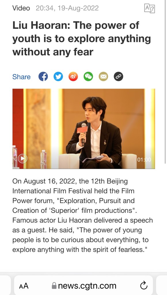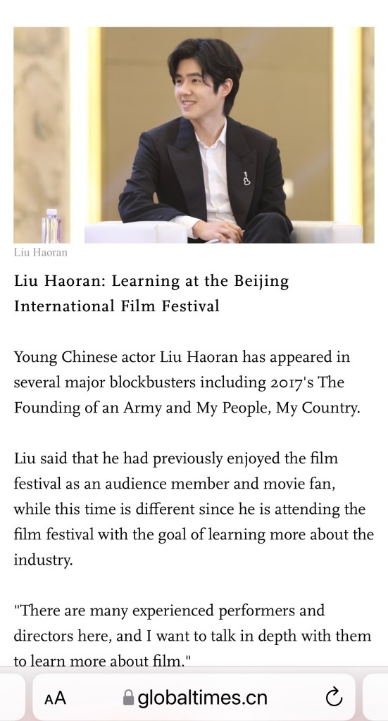 CGTN (China Global Television Network) là kênh tin tức tiếng Anh thuộc CCTV quản lý. The Global Times (Thời báo Hoàn cầu) là tờ báo trực thuộc Nhân dân Nhật báo của TQ. Hai trang tin tiếng Anh này đã đăng bài về việc Lưu Hạo Nhiên tham dự Diễn đàn Quyền lực Điện ảnh nằm trong khuôn khổ Liên hoan phim Quốc tế Bắc Kinh lần thứ 12.
